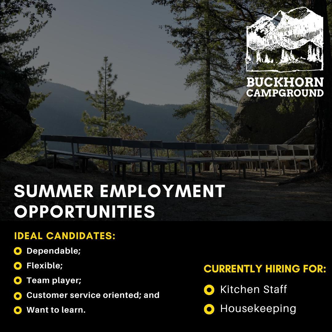To apply or get more information; please contact Mia Yip at myip@buckhorncampgrounds.com.